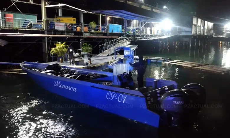 La lancha mide aproximadamente 45 pies de eslora. Además, presenta colores celeste con gris y cuenta con tres motores fuera de borda. De igual forma, la embarcación porta el nombre Monarca CP01. En su interior viajaban tres hombres de nacionalidad colombiana, de apellidos Cortés, Vallecillo y Carvajal, quienes quedaron detenidos en el sitio.